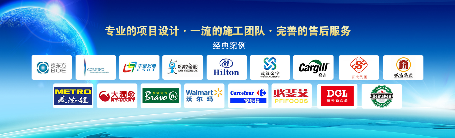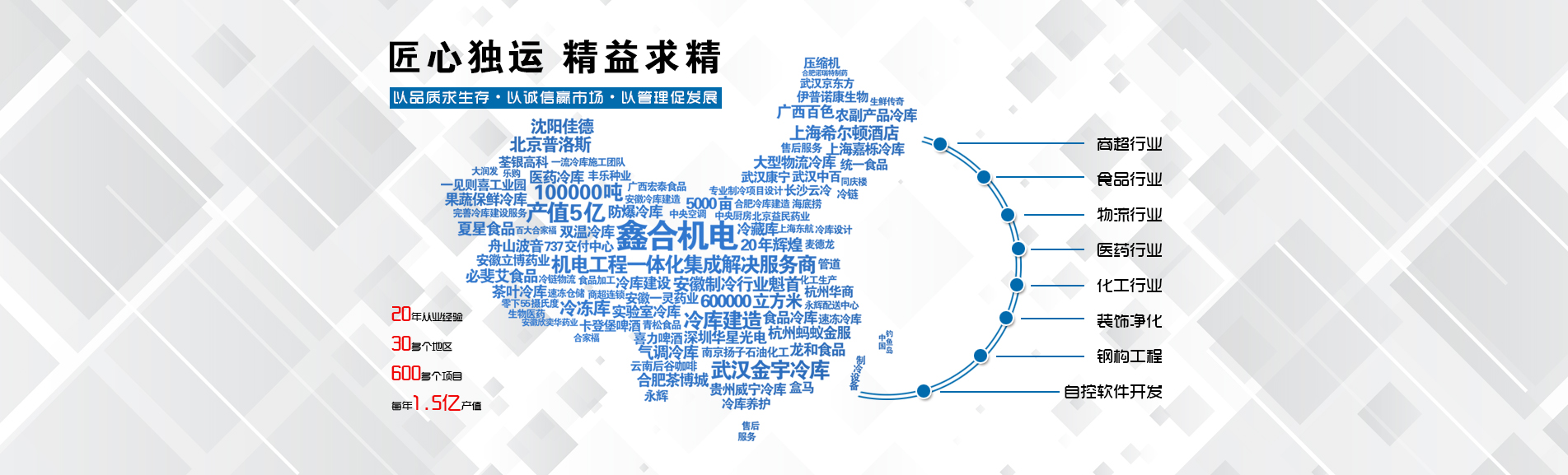 冷凍冷藏設(shè)備大型冷庫項目:   武漢中百物流冷庫(40000㎡)、蘇州、北京普洛斯大型物流庫(17000㎡)、沈陽佳德物流冷庫(20000㎡)、上海東航配餐物流庫(6000㎡)、杭州華商勾莊物流冷庫(24000㎡)、安徽安心蔬菜綠色食品冷庫(12000㎡)、武漢金宇冷庫(35000㎡)、必斐艾食品廠(14000㎡)、中國-東盟(百色)農(nóng)產(chǎn)品交易中心冷庫物流工程(30000㎡)、遵鐵物流冷鏈物流區(qū)建設(shè)項目中心冷庫物流工程(16500㎡)、長沙云冷產(chǎn)業(yè)園冷庫物流工程(21000㎡)等;大型中央空調(diào)項目:   武漢康寧顯示玻璃廠廠房、武漢京東方模組廠房、武漢華星光電模組廠房、深圳華星光電模組廠房,杭州阿里巴巴辦公樓,舟山波音737機場辦公樓,南京江北能源站、上海金融大酒店等